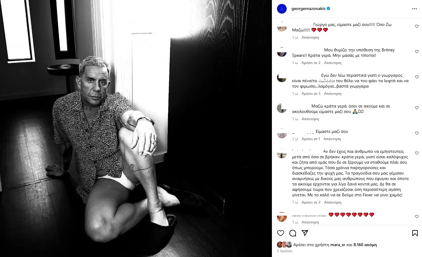 «Γιώργο μου η όμορφη ψυχή σου έχει δώσει δύναμη και χαρά σε τόσο κόσμο όλα αυτά τα χρόνια. Όταν βγεις, κράτα αυτήν την αγάπη που έχεις μοιράσει και άφησέ την να σε δυναμώσει κι εσένα», αποθέωσε κάποιος χρήστης του Instagram τον γνωστό καλλιτέχνη.