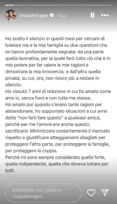 Αρχικά, η Κιάρα Φεράνι εξήγησε ότι επέλεξε να μη μιλήσει τόσο καιρό για να προστατεύσει τα παιδιά της, αλλά και τον εαυτό της. Πιο αναλυτικά, έγραψε: «Επέλεξα τη σιωπή αυτούς τους μήνες για να προσπαθήσω να προστατεύσω τον εαυτό μου και την οικογένειά μου για δύο ζητήματα που με έχουν σημαδέψει βαθιά: αφενός το εργασιακό θέμα, για το οποίο θα κάνω ό,τι περνάει από το χέρι μου για να αποδείξω την αθωότητά μου, και αφετέρου το ιδιωτικό, για το οποίο, πλέον, δεν μπορώ να σιωπήσω».