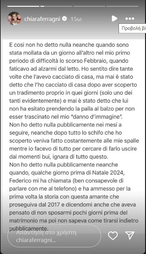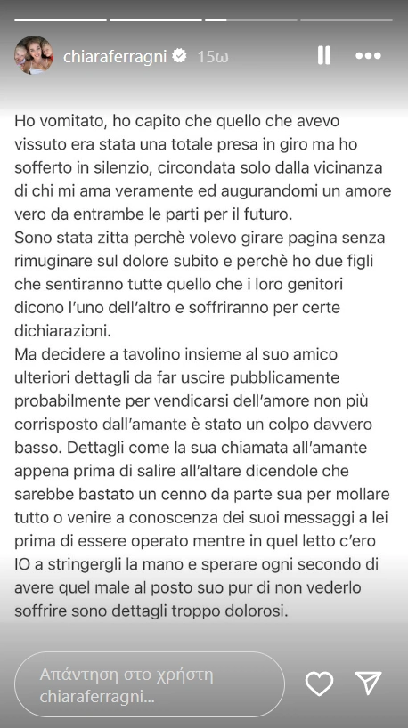 Στη συνέχεια, η Κιάρα Φεράνι έκανε μία ακόμα αποκάλυψη, αναφέροντας ότι την είχε αποκαλέσει με το όνομα της ερωμένης του. Πιο αναλυτικά, έγραψε. «Δεν είπα ποτέ δημοσίως τους μήνες που ακολούθησαν, ούτε καν μετά από όλες τις αηδίες που ανακάλυψα ότι γίνονταν συνεχώς πίσω από την πλάτη μου, ενώ εγώ έκανα ό,τι μπορούσα για να προσπαθήσω να τον βγάλω από τις σκοτεινές στιγμές, χωρίς να τα γνωρίζω όλα. Δεν είπα τίποτα δημοσίως ακόμη και όταν, λίγες ημέρες πριν από τα Χριστούγεννα του 2024, με φώναξε με το όνομα της ερωμένης του (γνωρίζοντας πολύ καλά ότι μιλούσε με εμένα στο τηλέφωνο) και παραδέχτηκε για πρώτη φορά τη σχέση του μαζί της που συνεχίζονταν από το 2017, λέγοντάς μου επίσης ότι είχε σκεφτεί να μην με παντρευτεί λίγες ημέρες πριν από το γάμο, αλλά στη συνέχεια δεν ήξερε πώς να κάνει πίσω δημοσίως».