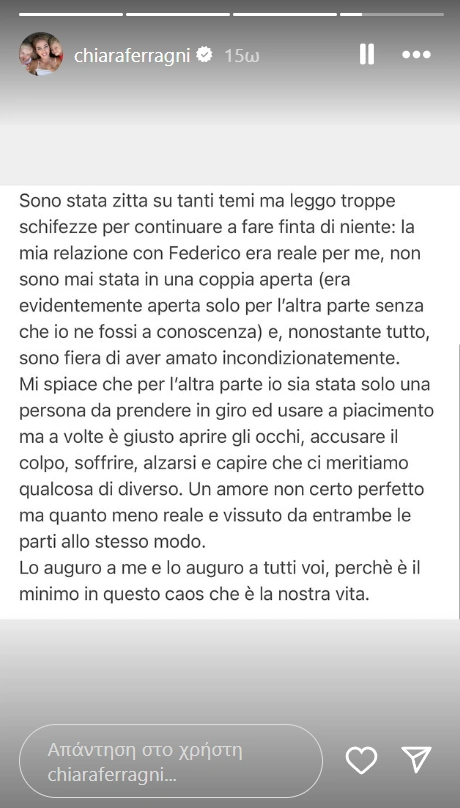 Κλείνοντας, η Κιάρα Φεράνι ξεκαθάρισε πως για εκείνη η σχέση της με τον Φέντεζ ήταν πραγματική, δηλώνοντας υπερήφανη που τον αγάπησε άνευ όρων. Όπως έγραψε: «Έχω σιωπήσει για τόσα πολλά θέματα, αλλά διαβάζω πάρα πολλές ανοησίες για να συνεχίσω να προσποιούμαι ότι δεν συμβαίνει τίποτα: η σχέση μου με τον Φεντερίκο ήταν πραγματική για μένα, δεν ήμουν ποτέ σε ένα ανοιχτό γάμο (ήταν προφανώς ανοιχτός μόνο για το άλλο μέρος χωρίς να το γνωρίζω) και, παρά ταύτα, είμαι περήφανη που αγάπησα άνευ όρων. Λυπάμαι που για την άλλη πλευρά ήμουν απλώς ένα άτομο που μπορούσε να πειράξει και να χρησιμοποιήσει κατά βούληση, αλλά μερικές φορές είναι σωστό να ανοίγουμε τα μάτια μας, να δεχόμαστε το χτύπημα, να υποφέρουμε, να σηκωνόμαστε και να συνειδητοποιούμε ότι αξίζουμε κάτι διαφορετικό. Μια αγάπη που σίγουρα δεν είναι τέλεια αλλά τουλάχιστον αληθινή και βιώνεται και από τα δύο μέρη εξίσου. Το εύχομαι για μένα και το εύχομαι για όλους σας, γιατί είναι το ελάχιστο σε αυτό το χάος που είναι η ζωή μας».