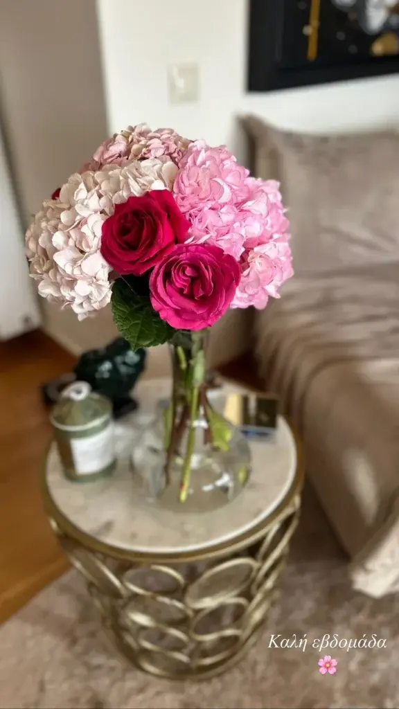 Στο στιγμιότυπο φαίνεται ένα βάζο με φρέσκα λουλούδια και ιδιαιτέρα διακοσμητικά σε ένα υπέροχο τραπεζάκι. Η παρουσιάστρια δεν είναι η πρώτη φορά που δείχνει το πολυτελές σπίτι της στα νότια προάστια.