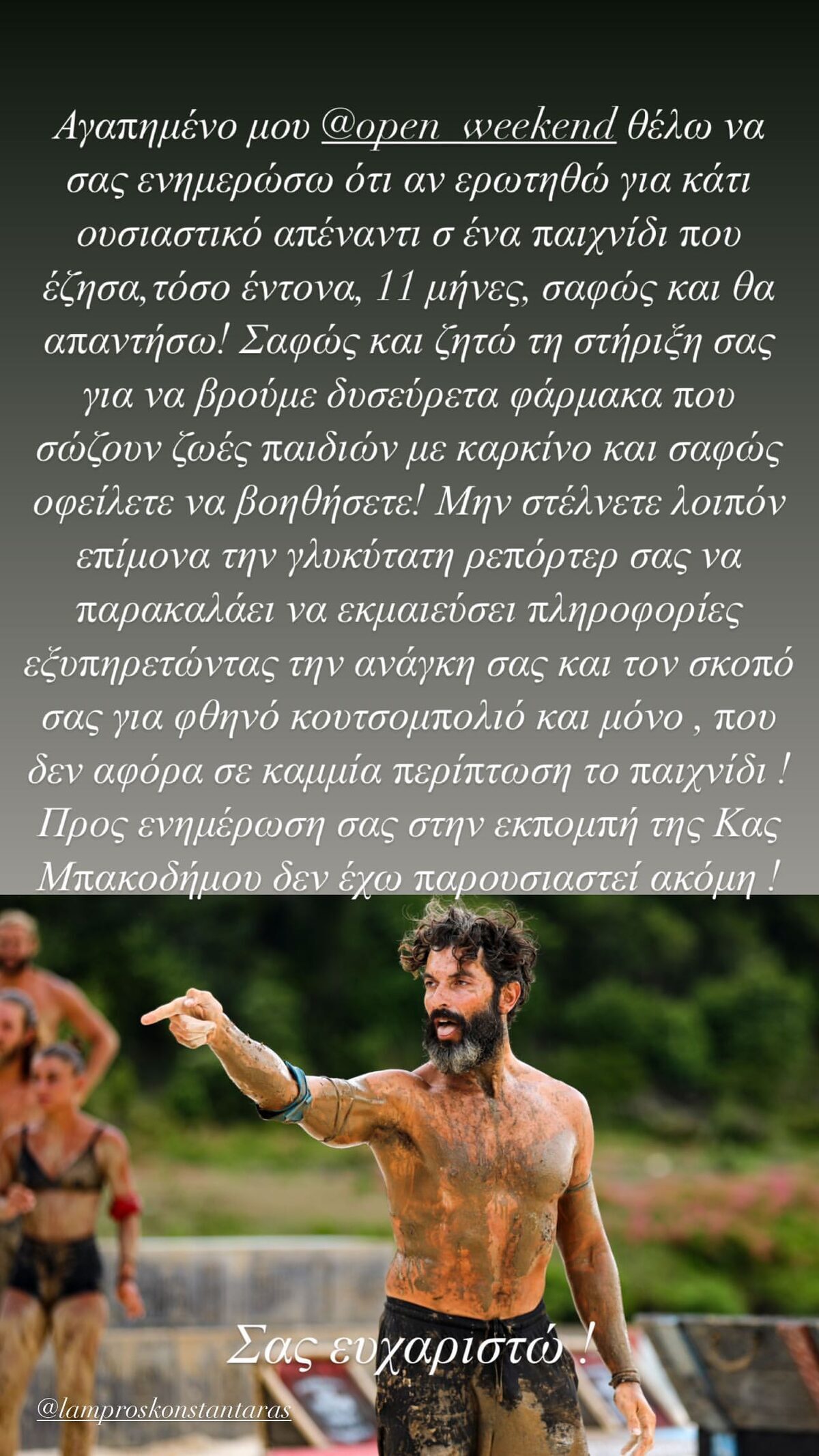 «Αγαπημένο μου Open Weekend θέλω να σας ενημερώσω ότι αν ερωτηθώ για κάτι ουσιαστικό απέναντι σε ένα παιχνίδι που έζησα τόσο έντονα 11 μήνες, σαφώς και θα απαντήσω. Σαφώς και ζητώ τη στήριξή σας για να βρούμε δυσεύρετα φάρμακα που σώζουν ζωές παιδιών με καρκίνο και σαφώς οφείλετε να βοηθήσετε. Μην στέλνετε λοιπόν επίμονα τη γλυκύτατη ρεπόρτερ σας να παρακαλάει να εκμαιεύσει πληροφορίες, εξυπηρετώντας την ανάγκη σας και τον σκοπό σας για φτηνό κουτσομπολιό και μόνο, που δεν αφορά σε καμία περίπτωση το παιχνίδι. Προς ενημέρωσή σας, στην εκπομπή της κυρίας Μπακοδήμου δεν έχω παρουσιαστεί ακόμη. Σας ευχαριστώ» έγραψε ο Σπύρος Μαρτίκας.