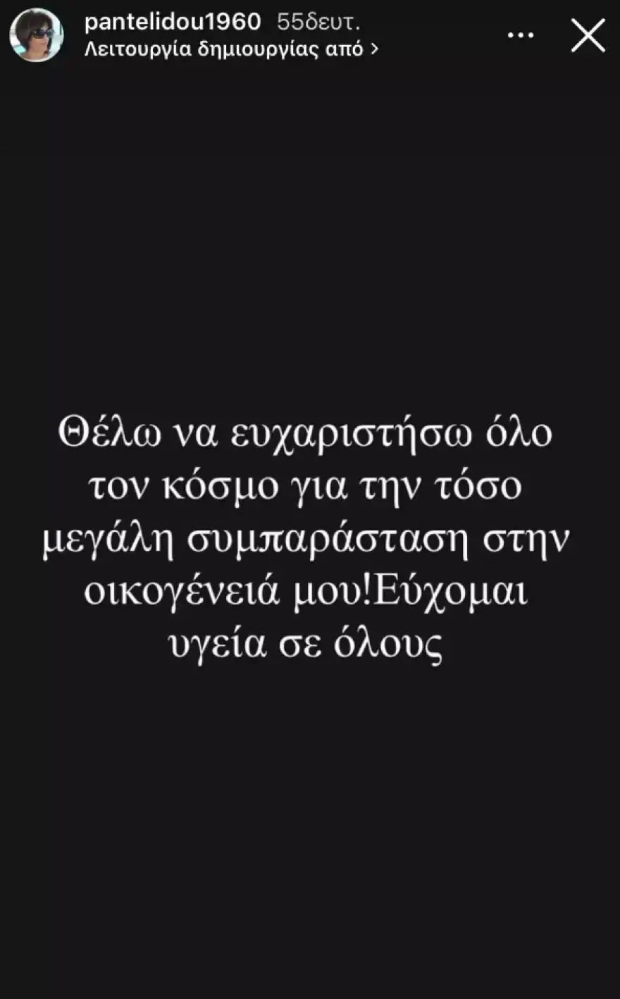 Μέσα από τον προσωπικό της λογαριασμό στο Instagram, η μητέρα του Παντελή Παντελίδη, του Τριαντάφυλλου Παντελίδη και του Κωνσταντίνου Παντελίδη έγραψε: «Θέλω να ευχαριστήσω όλο τον κόσμο για την τόσο μεγάλη συμπαράσταση στην οικογένειά μου! Εύχομαι υγεία σε όλους».