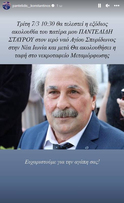 Οι αδερφοί του αγαπημένου τραγουδιστή Παντελή Παντελίδη, Κωνσταντίνος και Φίλιος με μια λιτή ιστορία στο Instagram είχαν ενημερώσει τους διαδικτυακούς τους ακόλουθους για την ημέρα και την ώρα της κηδείας του πατέρα τους.