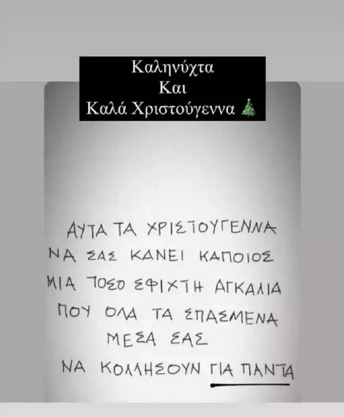 «Αυτά τα Χριστούγεννα να σας κάνει κάποιος μια τόσο σφιχτή αγκαλιά που όλα τα σπασμένα μέσα σας να κολλήσουν για πάντα», αναφέρει στο σχετικό story που έκανε.