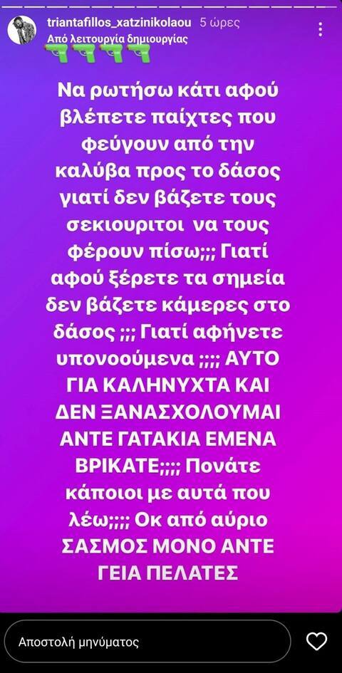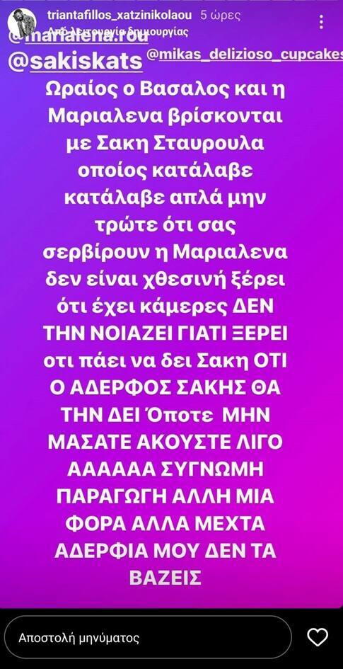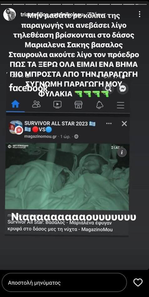 «Μη μασάτε ρε κόλπα της παραγωγής να ανεβάσει λίγο τηλεθέαση. Βρίσκονται στο δάσος Μαριαλένα, Σάκης, Βασάλος, Σταυρούλα. Ακούτε λίγο τον πρόεδρο. Πώς τα ξέρω όλα, είμαι ένα βήμα πιο μπροστά από την παραγωγή. Συγγνώμη παραγωγή μου, φιλάκια. Ωραίος ο Βασάλος και η Μαριαλένα βρίσκονται με Σάκη και Σταυρούλα, όποιος κατάλαβε κατάλαβε. Απλά μη τρώτε ότι σας σερβίρουν. Η Μαριαλένα δεν είναι χθεσινή ξέρει ότι έχει κάμερες, δεν τη νοιάζει γιατί ξέρει ότι πάει να δει τον Σάκη, ότι ο αδερφός Σάκης θα τη δει οπότε μη μασάτε!» έγραψε ο Τριαντάφυλλος.