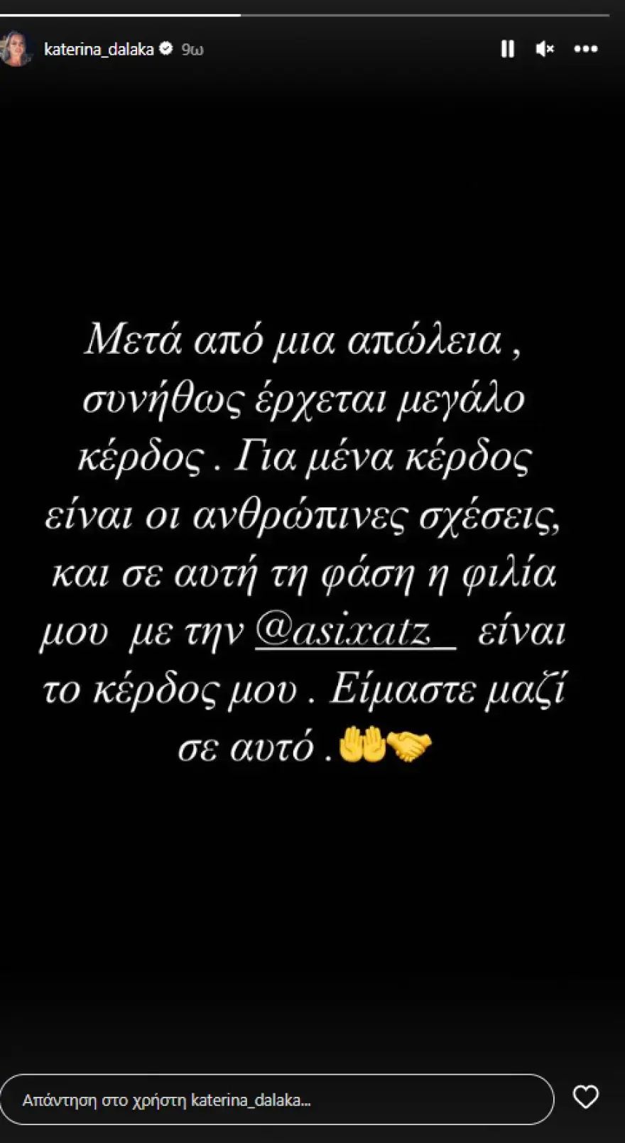 Σε ανάρτηση που έκανε στον προσωπικό της λογαριασμό στο Instagram, αναφέρει πως μπορεί να έχασε από αυτή την υπόθεση, τη συμμετοχή της στο ριάλιτι, αλλά κέρδισε μια φίλη, την Ασημίνα. «Μετά από μία απώλεια συνήθως έρχεται μεγάλο κέρδος. Για μένα κέρδος είναι οι ανθρώπινες σχέσεις και σε αυτή τη φάση η φιλία μου με την Ασημίνα είναι το κέρδος μου. Είμαστε μαζί σε αυτό», γράφει σε story.