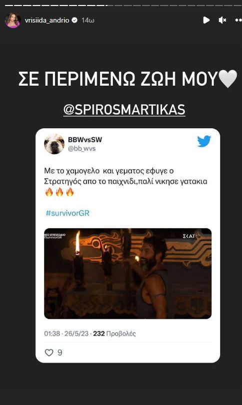 Λίγα λεπτά μετά την προβολή του επεισοδίου με την αποχώρηση του Σπύρου Μαρτίκα η Βρισηίδα Ανδριώτου έγραψε σε ανάρτηση που αναδημοσίευσε από το twitter: «Σε περιμένω ζωή μου».