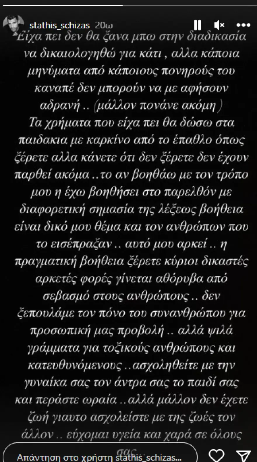 «Είχα πει πως δεν θα ξαναμπώ στη διαδικασία να δικαιολογηθώ για κάτι. Αλλά κάποια μηνύματα από κάποιους πονηρούς του καναπέ δεν μπορούν να με αφήσουν αδρανή. (Μάλλον πονάνε ακόμη). Τα χρήματα που είχα πει θα δώσω στα παιδάκια με καρκίνο από το έπαθλο, όπως ξέρετε, αλλά κάνετε ότι δεν ξέρετε, δεν έχουν παρθεί ακόμα. Το αν βοηθάω με τον τρόπο μου ή έχω βοηθήσει στο παρελθόν με διαφορετική σημασία της λέξεως, βοήθεια είναι δικό μου θέμα και των ανθρώπων που το εισέπραξαν. Αυτό μου αρκεί.