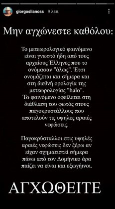 Το φαινόμενο «άλως», όπως μας ενημέρωσε ο Λιανός, οφείλεται στη διάθλαση του φωτός στους παγοκρυστάλλους που αποτελούν τις υψηλές αραιές νεφώσεις.