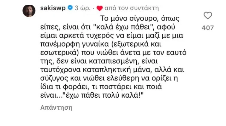«Το μόνο σίγουρο, όπως είπες, είναι ότι “καλά έχω πάθει”, αφού είμαι αρκετά τυχερός να είμαι μαζί με μια πανέμορφη γυναίκα (εξωτερικά και εσωτερικά) που νιώθει άνετα με τον εαυτό της, δεν είναι καταπιεσμένη, είναι ταυτόχρονα καταπληκτική μάνα, αλλά και σύζυγος και νιώθει ελεύθερη να ορίζει η ίδια τι φοράει, τι ποστάρει και ποια είναι… «έχω πάθει πολύ καλά!»»!