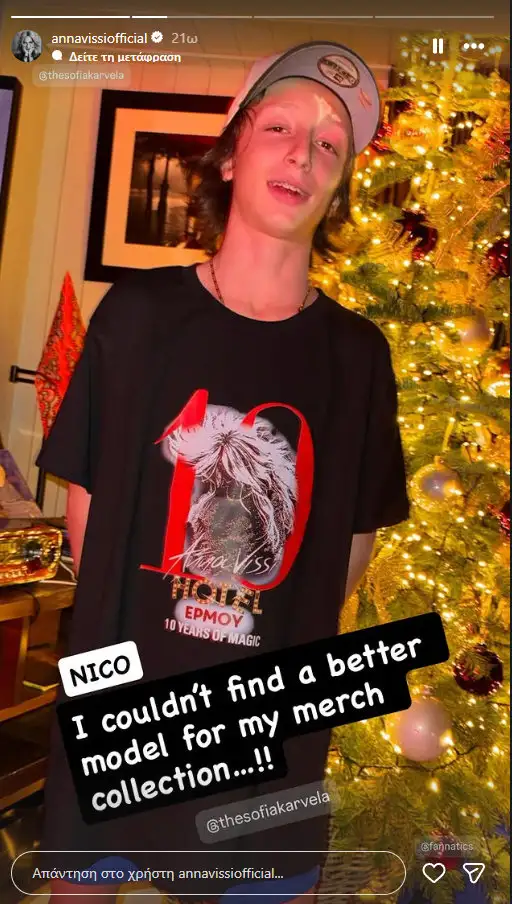 Η Άννα Βίσση μέσα από τον λογαριασμό της στο instagram ποζάρει από την πολυθρόνα, ενώ στην άλλη βλέπουμε τον εγγονό της να φορά το T-Shirt για τα 10 χρόνια των εμφανίσεών της σε γνωστό νυχτερινό κέντρο. Όπως σχολιάζει στην ανάρτησή της, δεν θα μπορούσε να βρει καλύτερο μοντέλο!