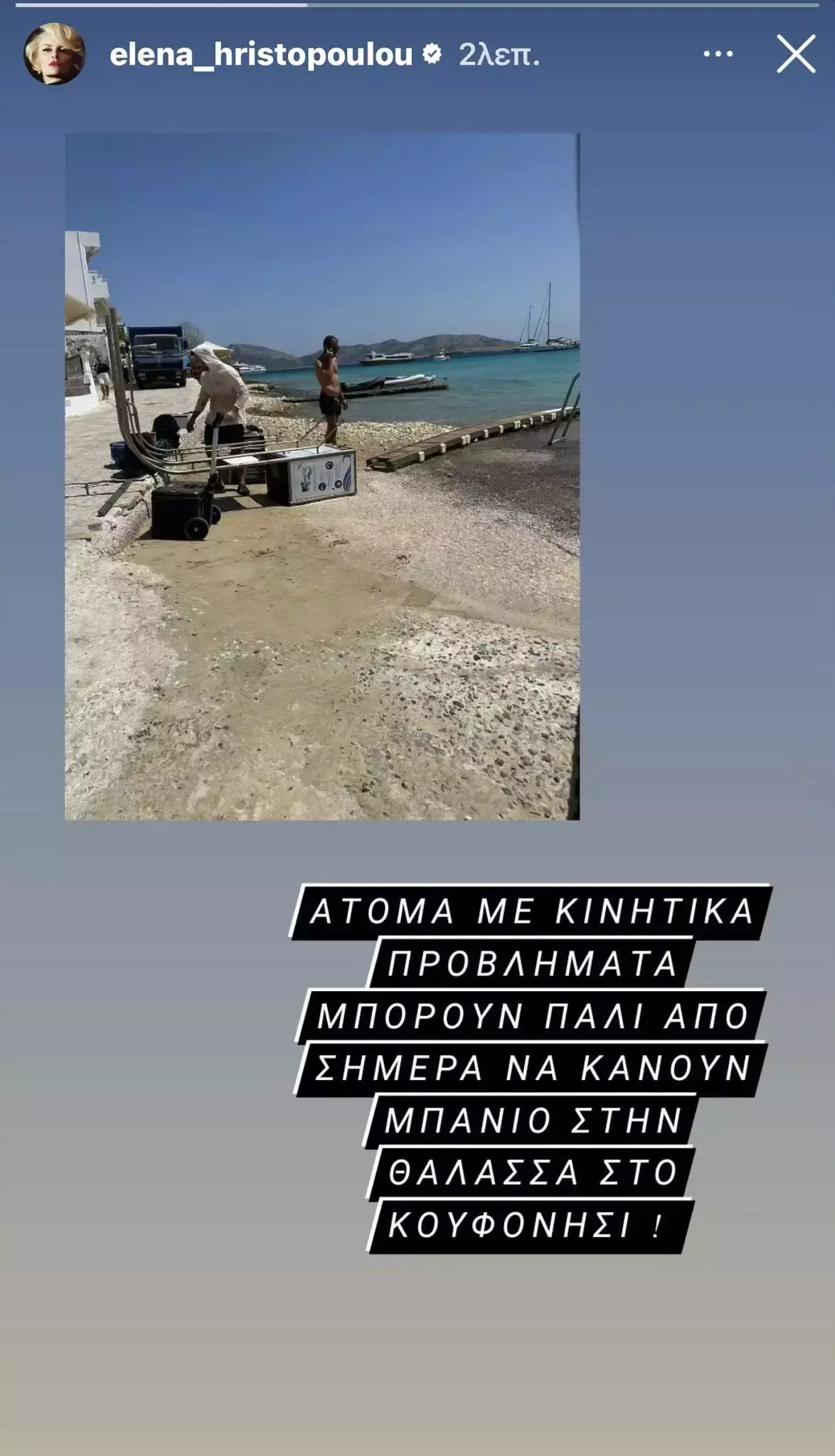 «Άτομα με κινητικά προβλήματα μπορούν πάλι από σήμερα να κάνουν μπάνιο στη θάλασσα στο Κουφονήσι» έγραψε στην ανάρτησή της η Έλενα Χριστοπούλου.