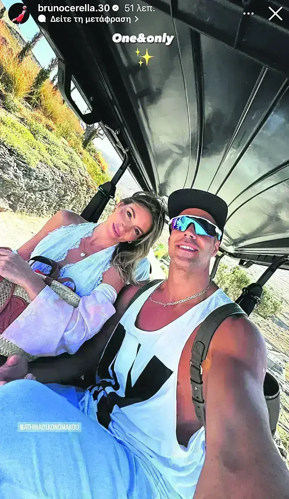 Το πιο hot ειδύλλιο είναι αυτό της Αθηνάς Οικονομάκου και του Μπρούνο Τσερέλα. Σχεδόν από την πρώτη στιγμή, το ζευγάρι δεν έκρυψε τον έρωτά του, ενώ πλέον οι κοινές φωτογραφίες πρωταγωνιστούν στα social media. Η επιχειρηματίας και ο μπασκετμπολίστας βρίσκονται στην Τζια, σε πολυτελές ξενοδοχείο του νησιού, όπου απολαμβάνουν στιγμές ξεκούρασης. Μάλιστα, ένα ενσταντανέ τους έκανε το γύρο του Διαδικτύου και απέδειξε ότι θα συζητηθούν πολύ.