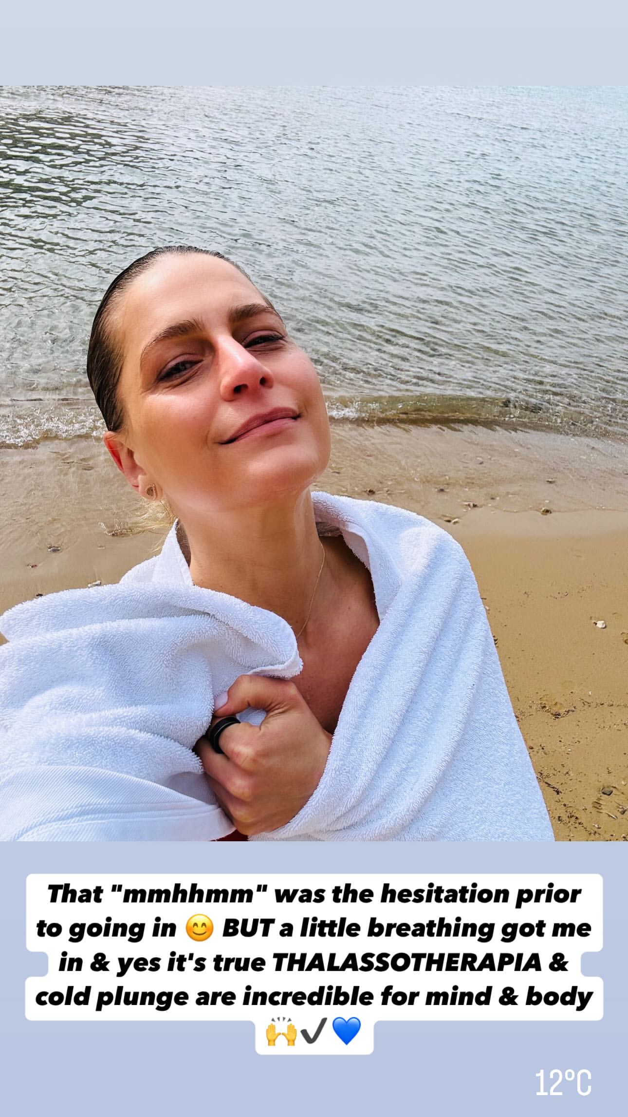 «Αυτό το μμμμ που ήταν ο δισταγμός πριν μπω μέσα, αλλά με μία μικρή ανάσα μπήκα και ναι… Είναι μία αληθινή θαλασσοθεραπεία και η κρύα βουτιά είναι ιδανική για το μυαλό και το σώμα», έγραψε. «Κυριακή στην Αθήνα. O απόλυτος προορισμός ευεξίας χωρίς καμία προσπάθεια. Πάμε. Η σημερινή ημέρα ήταν η ιδανική για μία κρύα βουτιά και ήταν τόσο ωραία», πρόσθεσε με άλλη ανάρτηση.
