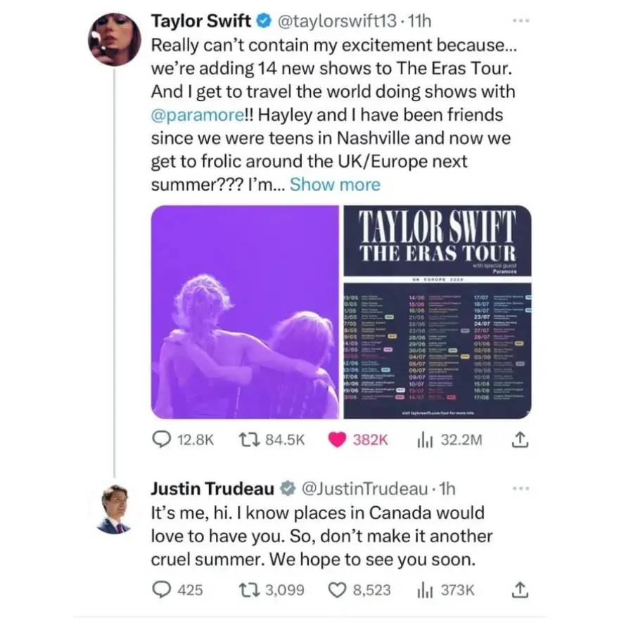 «Γεια. Εγώ είμαι. Ξέρω μέρη στον Καναδά που θα χαίρονταν πάρα πολύ να σε δουν. Επομένως, μην το κάνεις αυτό άλλο ένα σκληρό καλοκαίρι (cruel summer). Ελπίζουμε να σε δούμε σύντομα», έγραψε ο Τριντό, απαντώντας αργά χθες το βράδυ σε ένα tweet της Τέιλορ Σουίφτ που είχε αναρτηθεί νωρίτερα με τις νέες ημερομηνίες και σταθμούς της περιοδείας της.
