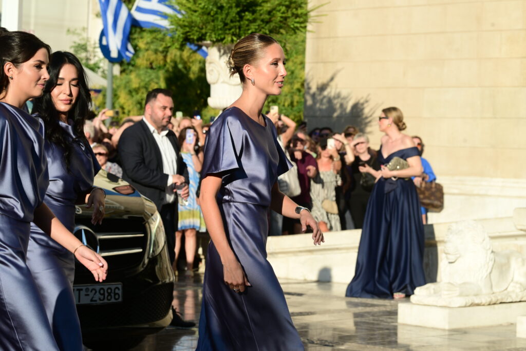 Η νύφη, μέσα σε δημιουργία της Σήλιας Κριθαριώτη που θυμίζει παραμύθι, έφτασε συνοδευμένη από τον αδερφό της Παύλο ενώ στο πλευρό της βρίσκεται όλη η οικογένειά της.