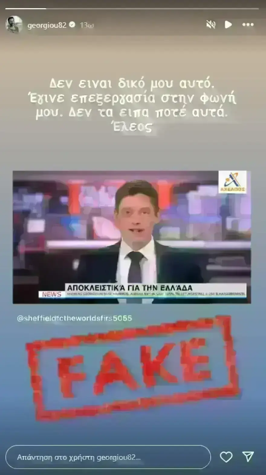Μάλιστα, σε story του στο Instagram ο Ανδρέας Γεωργίου γνωστοποίησε την απάτη στην οποία ενεπλάκη το όνομά του και έγραψε: «Δεν είναι δικό μου αυτό. Έγινε επεξεργασία στη φωνή μου. Δεν τα είπα ποτέ αυτά. Έλεος».