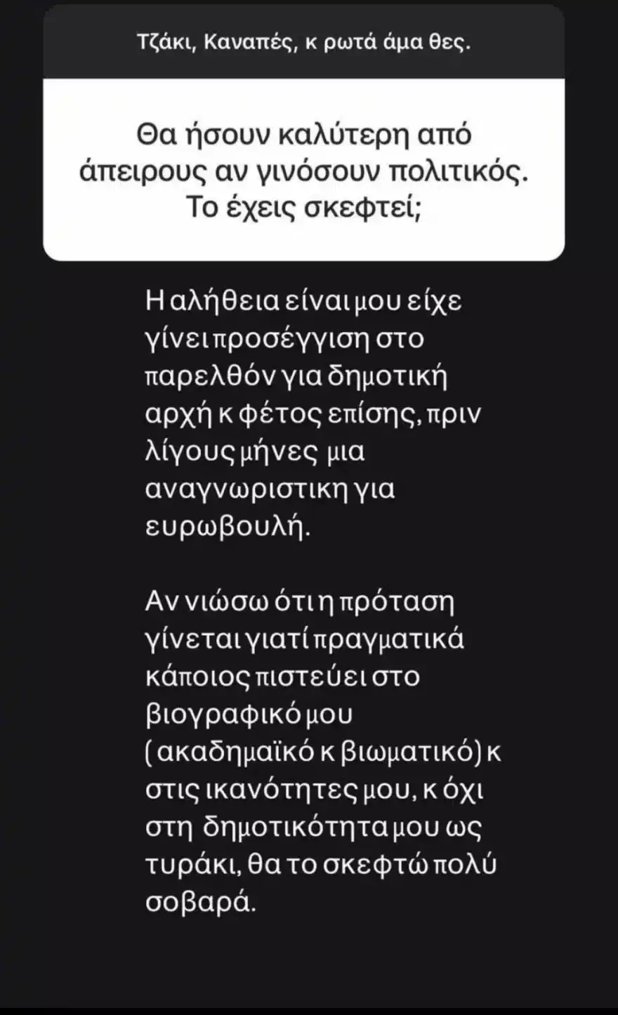 Σε ερώτηση για το αν έχει σκεφτεί να γίνει πολιτικός, η Ελεονώρα Μελέτη απάντησε: «Η αλήθεια είναι ότι μου είχε γίνει προσέγγιση στο παρελθόν για Δημοτική Αρχή και φέτος επίσης, μια αναγνωριστική για Ευρωβουλή. Αν νιώσω ότι η πρόταση γίνεται γιατί πραγματικά κάποιος πιστεύει στο βιογραφικό μου (ακαδημαϊκό και βιωματικό) και στις ικανότητές μου και όχι στη δημοτικότητά μου ως τυράκι, θα το σκεφτώ πολύ σοβαρά».