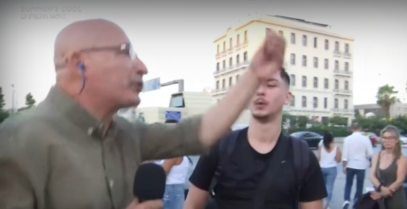 Κάποια στιγμή ενώ μετέδιδε το ρεπορτάζ κατευθύνθηκε σε μια παρέα νεαρών που ετοιμάζονταν να μπουν στο πλοίο για την Πάρο.