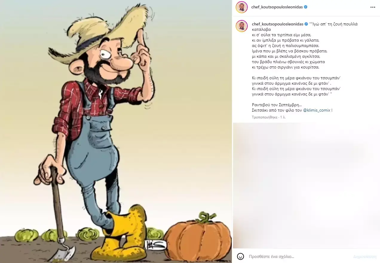 Ο γνωστός και διακεκριμένος σεφ ανέβασε ένα ωραίο σκίτσο, τον εαυτό του ντυμένο αγρότη, και συνόδευσε τη φωτογραφία με στίχους από το «Ποιμενικό ροκ» του Γιάννη Μηλιώκα.