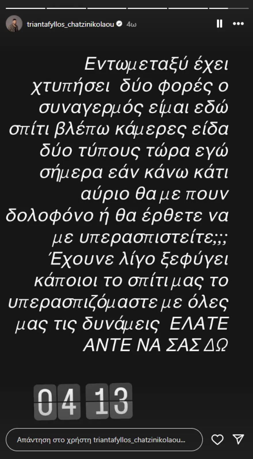Πιο συγκεκριμένα, έγραψε: «Εντωμεταξύ έχει χτυπήσει δυο φορές ο συναγερμός. Είμαι εδώ σπίτι βλέπω κάμερες, είδα δυο τύπους τώρα. Εγώ σήμερα εάν κάνω κάτι, αύριο θα με πουν δολοφόνο ή θα έρθετε να με υπερασπιστείτε; Έχουνε λίγο ξεφύγει κάποιοι. Το σπίτι μας το υπερασπιζόμαστε με όλες μας τις δυνάμεις. Ελάτε να σας δω».