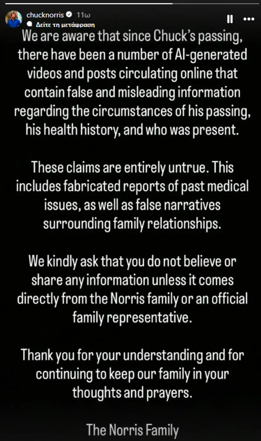 Η ανακοίνωση της οικογένειας αναφέρει: «Γνωρίζουμε ότι από τον θάνατο του Τσακ Νόρις, έχουν κυκλοφορήσει στο διαδίκτυο πολλά βίντεο και αναρτήσεις που έχουν δημιουργηθεί με τεχνητή νοημοσύνη και περιέχουν ψευδείς και παραπλανητικές πληροφορίες σχετικά με τις συνθήκες του θανάτου του, το ιατρικό του ιστορικό και το ποιοι ήταν παρόντες. Οι ισχυρισμοί αυτοί είναι εντελώς αναληθείς. Αυτό περιλαμβάνει κατασκευασμένες αναφορές για παλαιότερα ιατρικά προβλήματα, καθώς και ψευδείς αφηγήσεις γύρω από τις οικογενειακές σχέσεις. Σας παρακαλούμε να μην πιστεύετε ή να μην κοινοποιείτε καμία πληροφορία, εκτός αν προέρχεται απευθείας από την οικογένεια Νόρις ή από επίσημο εκπρόσωπό της. Σας ευχαριστούμε για την κατανόηση και για το ότι συνεχίζετε να κρατάτε την οικογένειά μας στις σκέψεις και τις προσευχές σας. Η οικογένεια Νόρις».