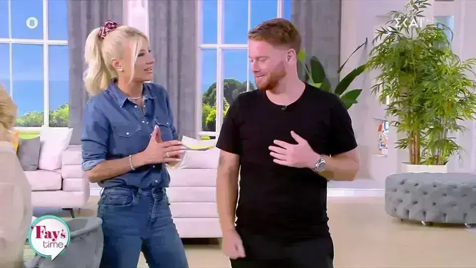 Όταν μπήκε στο πλατό του «Fay’s Time» χαιρέτησε την παρουσιάστρια και ζήτησε συγγνώμη για την αργοπορία του.
