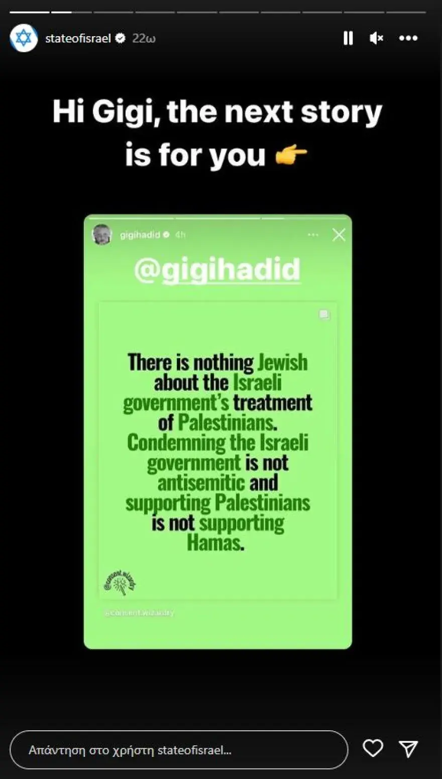 Γρήγορα, η κυβέρνηση του Ισραήλ φρόντισε να απαντήσει στα όσα έγραψε η Τζίτζι Χαντίντ με μία σειρά από stories στο Instagram.