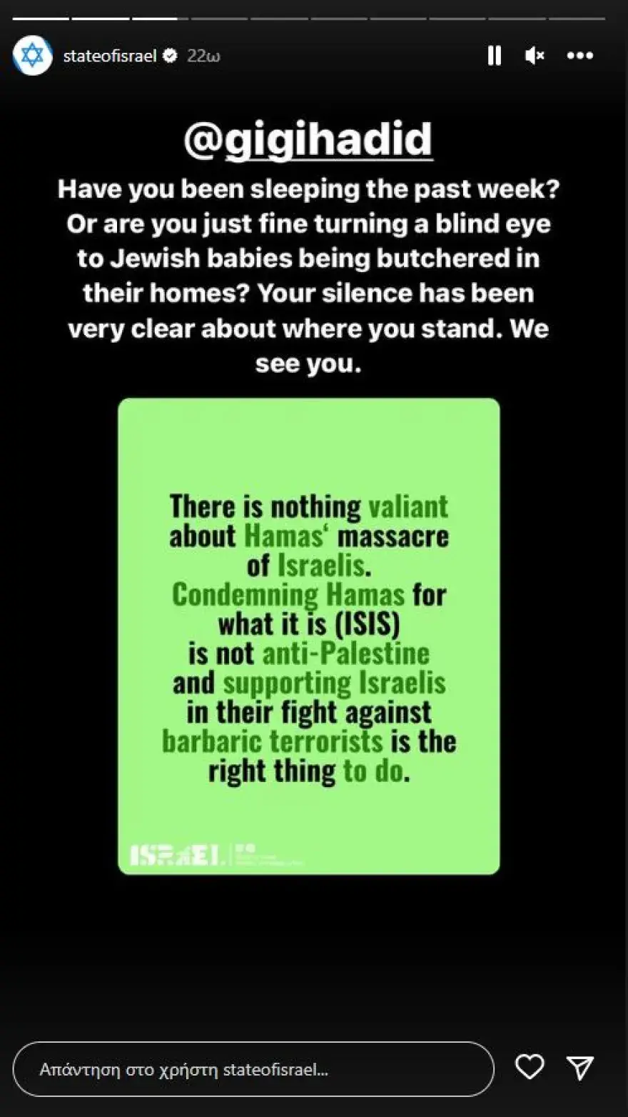 «Kοιμήθηκες την τελευταία εβδομάδα; Ή απλά γυρνάς την πλάτη σου στα μωρά των Εβραίων που σφαγιάζονται στα σπίτια τους; Η σιωπή σου είναι απόλυτα ξεκάθαρη για το ποιον υποστηρίζεις. Σε βλέπουμε», γράφει το story που ανέβηκε στον επίσημο λογαριασμό που διατηρεί η κυβέρνηση στο Instagram.