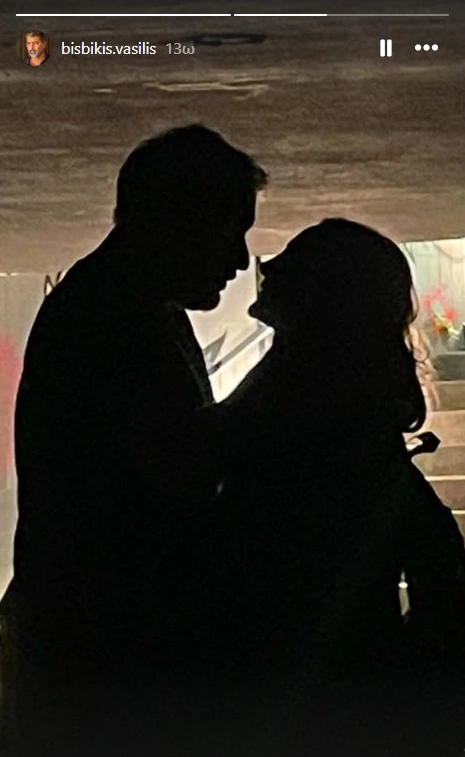 Στο story που δημοσίευσε ο Βασίλης Μπισμπίκης στον προσωπικό του λογαριασμό στο Instagram, φαίνονται οι σκιές εκείνου και της τραγουδίστριας, ενώ κοιτούν ο ένας τον άλλο.