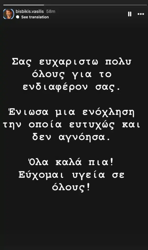 «Σας ευχαριστώ πολύ όλους για το ενδιαφέρον σας. Ένιωσα μια ενόχληση την οποία ευτυχώς και δεν αγνόησα. Όλα καλά πια! Εύχομαι υγεία για όλους», έγραψε ο Βασίλης Μπισμπίκης σε story του.