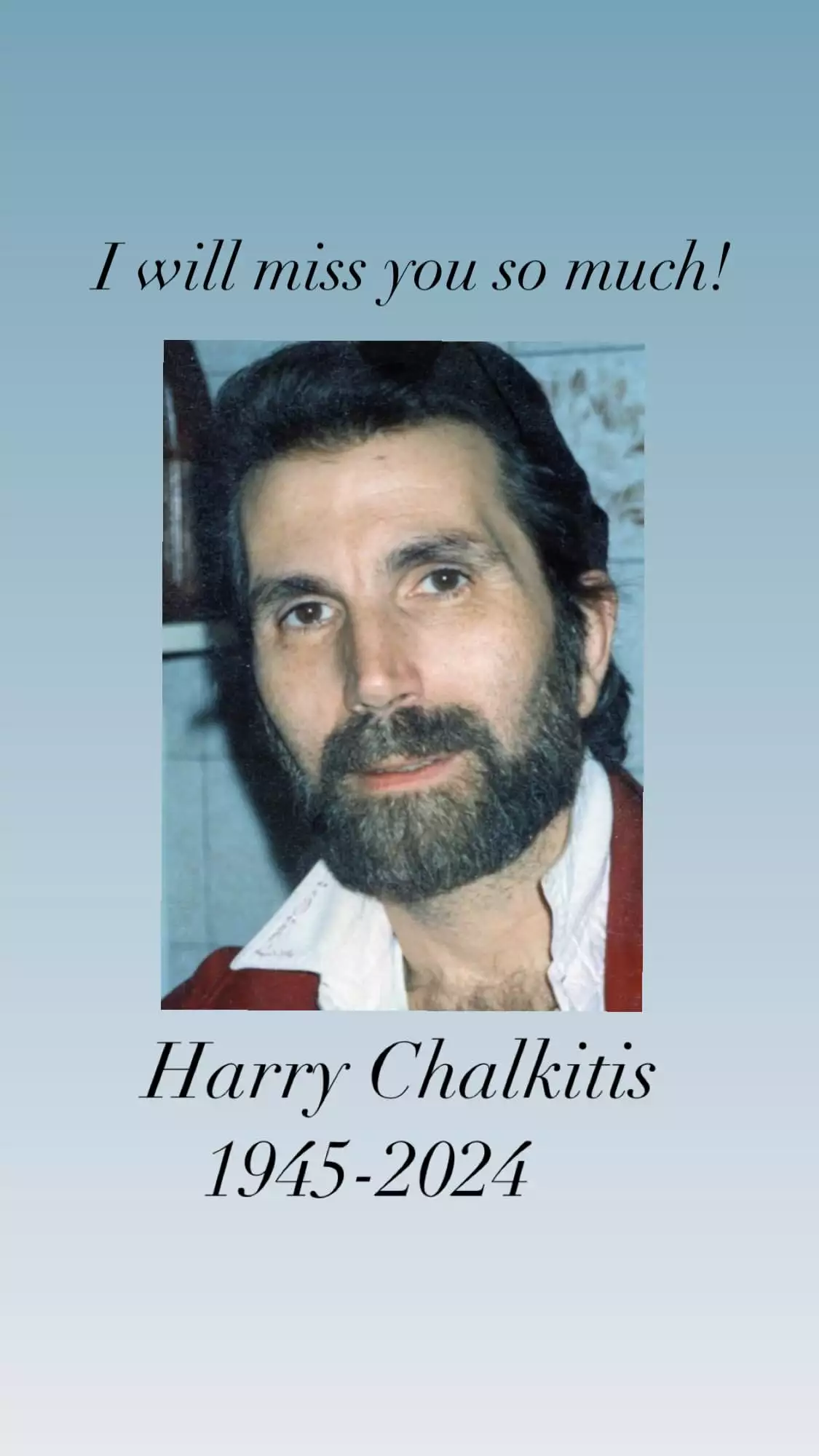 «Θα μου λείψεις τόσο πολύ» και στη συνέχεια συμπλήρωσε «Χάρης Χαλκίτης, 1945-2024».