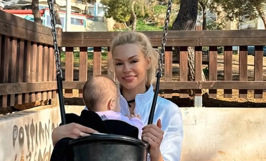 Στις φωτογραφίες που ανάρτησε, η κόρη της κάθεται σε μία κούνια, ενώ εκείνη έχει γονατίσει μπροστά της.