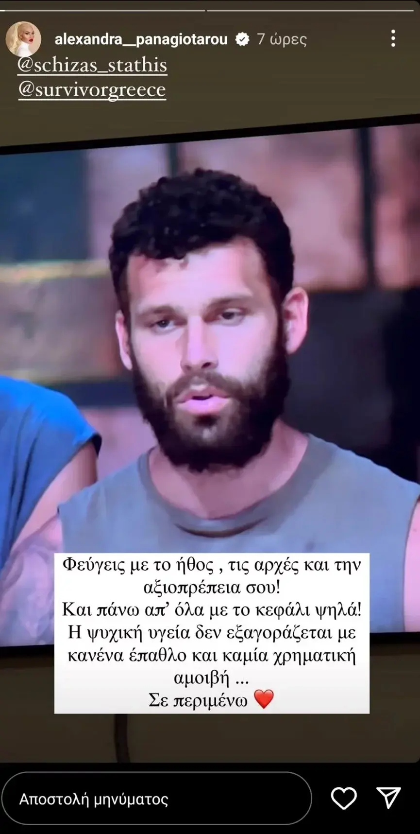 Ο Στάθης αποτελεί παρελθόν πια για το survivor all star και η Αλεξάνδρα Παναγιώταρου έγραψε σε instastastories: «Φεύγεις με το ήθος, τις αρχές και την αξιοπρέπειά σου. Και πάνω από όλα με το κεφάλι ψηλά. Η ψυχική υγεία δεν εξαγοράζεται με κανένα έπαθλο και καμία χρηματική αμοιβή… Σε περιμένω».