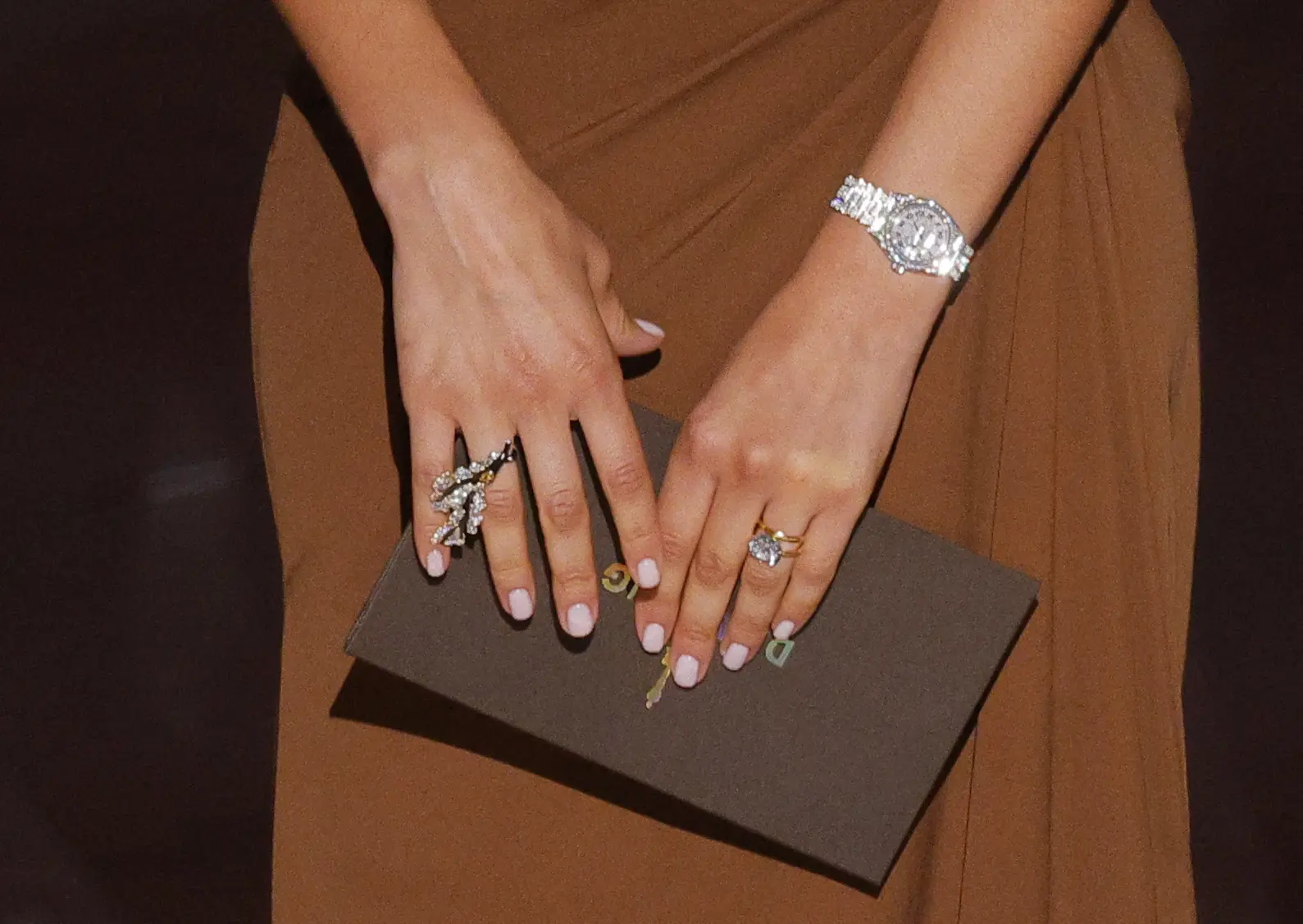 Για την εμφάνισή της επέλεξε ένα μακρύ καφέ φόρεμα με έναν ώμο έξω, ενώ το σύνολο ολοκλήρωσε με εντυπωσιακά κοσμήματα. Ωστόσο, αυτό που τράβηξε περισσότερο τα βλέμματα ήταν τα δαχτυλίδια της και ιδιαίτερα ένα χρυσό, που πολλοί θεώρησαν ότι μοιάζει με βέρα.