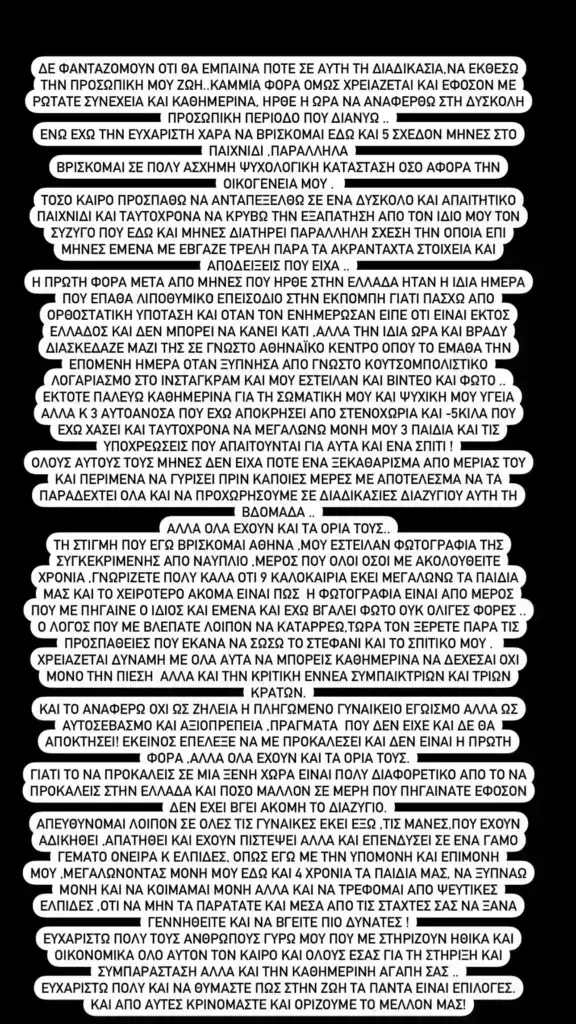 «Και ταυτόχρονα να μεγαλώνω μόνη μου τρία παιδιά, και τις υποχρεώσεις που απαιτούνται για αυτά και ένα σπίτι. Όλους αυτούς τους μήνες δεν είχα ποτέ ένα ξεκαθάρισμα από μεριάς του και περίμενα να γυρίσει πριν κάποιες μέρες με αποτέλεσμα να τα παραδεχτεί όλα και να προχωρήσουμε σε διαδικασίες διαζυγίου αυτή την εβδομάδα. Όλα έχουν και τα όρια τους. Τη στιγμή που εγώ βρίσκομαι Αθήνα, μου έστειλαν φωτογραφία της συγκεκριμένης από Ναύπλιο, μέρος που όλοι όσοι με ακολουθείτε χρόνια γνωρίζετε πολύ καλά ότι εννιά καλοκαίρια εκεί μεγαλώνουν τα παιδιά μας.