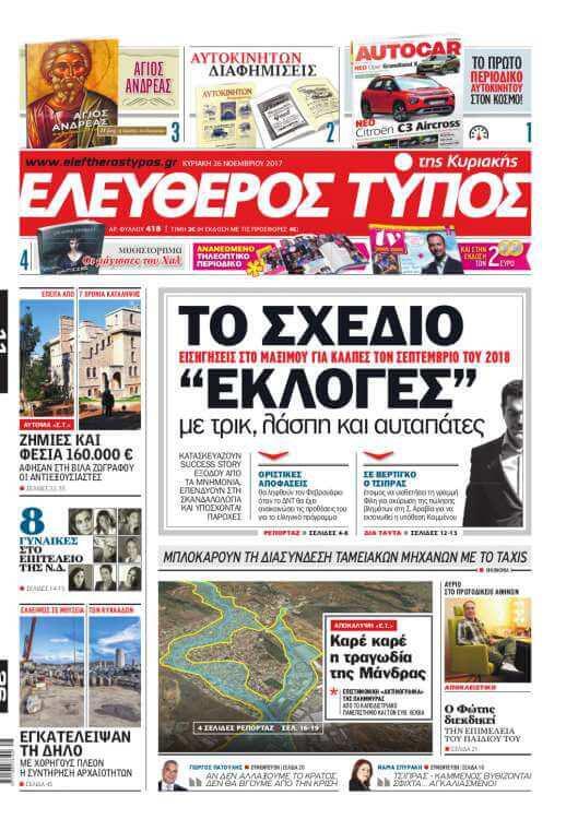 Το βασικό θέμα της εφημερίδας μας είναι οι εισηγήσεις που γίνονται στο μέγαρο Μαξίμου να στηθούν κάλπες τον Σεπτέμβριο του 2018. Μετά από περίπου τρία χρόνια διακυβέρνησης ΣΥΡΙΖΑ-ΑΝ.ΕΛ., η προσπάθεια καταλογισμού ευθυνών στους προηγούμενους και ο υπέρμετρος λαϊκισμός αντιμετωπίζονται ως προσπάθεια υποτίμησης των πολιτών, με αδιαφορία ως και οργή.