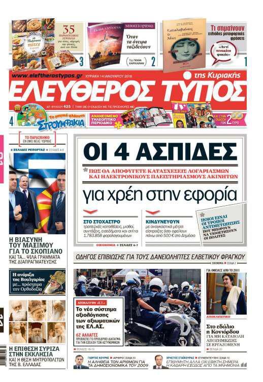 Το μεγάλο θέμα των χρεών στην εφορία είναι βασικό στον Ελεύθερο Τύπο της Κυριακής όπου παρουσιάζονται οι τέσσερις ασπίδες προστασίας για τους πολίτες. Η εφημερίδα εξηγεί πως θα αποφύγετε τις κατασχέσεις λογαριασμών και τους ηλεκτρονικούς πλειστηριασμούς ακινήτων. Στο στόχαστρο μπαίνουν τραπεζικές καταθέσεις, μισθοί, συντάξεις και σπίτια 1.783.858 φορολογουμένων. Κινδυνεύουν με αναγκαστικά μέτρα είσπραξης όσοι οφείλουν πάνω από 500 ευρώ στο Δημόσιο. Ποιοι είναι οι τρόποι αντιμετώπισης που μπορούν να υιοθετήσουν οι πολίτες για να αποφύγουν όλα αυτά τα βάρη.