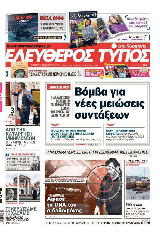 Αποκλειστικό είναι ο βασικό θέμα του Ελεύθερου Τύπου της Κυριακής με «βόμβα» η οποία έχει να κάνει με νέες μειώσεις στις συντάξεις. Η αναλογιστική μελέτη για το ασφαλιστικό δείχνει πως έρχεται και νέο «ψαλίδι». Στο 17,5% του ΑΕΠ έναντι τους στόχου που ήταν 16,2% ανέρχεται η ετήσια δαπάνη για τις συντάξεις. Στα τέσσερα δισεκατομμύρια ευρώ φτάνει το έλλειμμα που πληρώνει το κράτος. Παρα μάλιστα τις αυξημένες εισφορές και τις περικοπές που έχουν νομοθετηθεί για το 2019 τα χρήματα δεν επαρκούν.