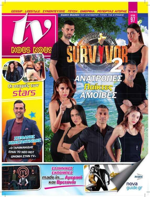 Τέλος μαζί με τον Ελεύθερο Τύπο της Κυριακής κυκλοφορεί εντελών δωρεάν και το ανανεωμένο τηλεοπτικό περιοδικό TV Kους Κους! Σε αυτό το τεύχος θα διαβάσετε μεταξύ των άλλων όλα τα νεα για το Survivor 2 και συνέντευξη του Στέφανου Κωνσταντινίδη.