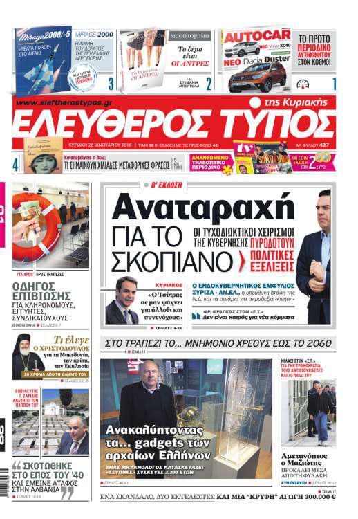 Το θέμα των ημερών το οποίο δεν είναι άλλο από το Σκοπιανό, είναι και το βασικό θέμα της εφημερίδας μας. Με τίτλο «αναταραχή για το Σκοπιανό» ο Ελεύθερος Τύπος της Κυριακής αναλύει τους χειρισμούς της κυβέρνησης για την διαπραγμάτευση της ονομασίας των Σκοπίων αλλά καταγράφει και τις πολιτικές αντιδράσεις που έχουν προκαλέσει οι χειρισμού του Αλέξη Τσίπρα.