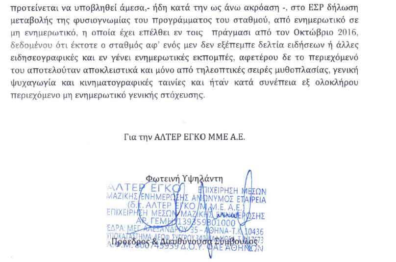 Στην επιστολή η εταιρεία του Ευάγγελου Μαρινάκη ζητεί να διεκδικήσει η «Τηλέτυπος» ενώπιον του ΕΣΡ το καθεστώς συνέχισης της λειτουργίας του σταθμού, με το επιχείρημα πως ήδη από τον Οκτώβριο του 2016 το κανάλι λειτουργεί εν τοις πραγμάσι ως θεματικός σταθμός.
