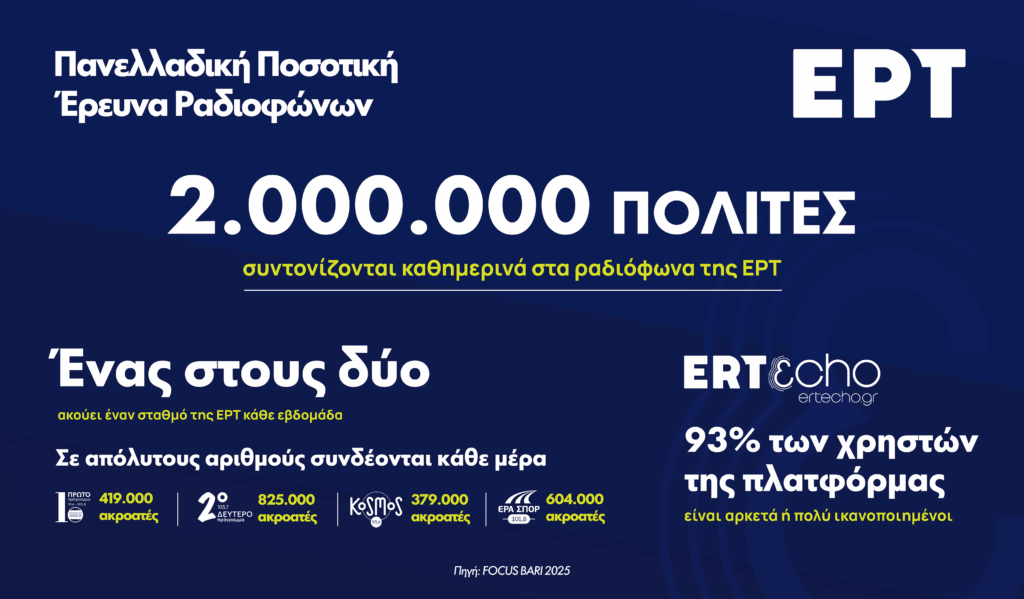 Παράλληλα, εγκωμιαστικά είναι τα σχόλια για την πλατφόρμα ERTεcho, μέσω της οποία οι χρήστες μπορούν να ακούν όλο το περιεχόμενο των ραδιοφωνικών σταθμών σ’ ένα ενιαίο ψηφιακό οικοσύστημα. Το 96% των χρηστών χαρακτηρίζουν την πλατφόρμα χρήσιμη, το 95% ευχάριστη και το 93% φιλική. Μάλιστα, το 93% των ερωτηθέντων δηλώνουν αρκετά ή πολύ ικανοποιημένοι από τη χρήση της.