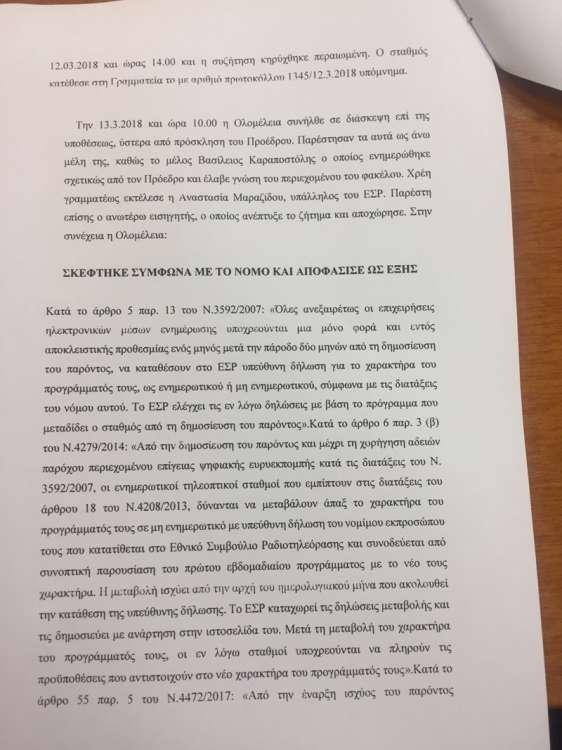 Η κρίση αυτή των μελών του ΕΣΡ έγινε μετά και την κατάθεση του υπομνήματος, χθες, του από την Τηλέτυπος, ενώ τα συμπληρωματικά στοιχεία που εστάλησαν σήμερα, δεν ελήφθησαν υπόψιν. Εκτός από την επιστολή του ΣΚΑΪ στο ΕΣΡ πυο ζητούσε διακοπή λειτουργίας του καναλιού, υπήρξε και εξώδικο της Finos Film που ενημέρωνε για χρέη της Τηλέτυπος.