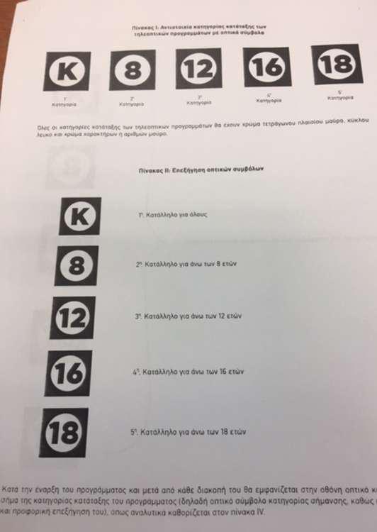 Όλα τα τηλεοπτικά προγράμματα κατατάσσονται σε πέντε κατηγορίες ανάλογα με τον βαθμό της δυσμενούς επίδρασης που μπορεί να έχει το περιεχόμενό τους στην εν γένει σωματική, ηθική, πνευματική και ψυχική ανάπτυξη των ανηλίκων (προσώπων ηλικίας έως 18 ετών), υπογραμμίζει το ΕΣΡ. Το βασικό της χαρακτηριστικό στοιχείο είναι πως προτείνει το υφιστάμενο σύστημα σήμανσης με τους κύκλος και τα τετράγωνα, από το γράμμα «Κ» και τους αριθμούς από 8 ως 18.