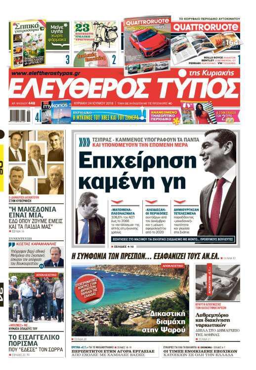 Με κεντρικό τίτλο «Επιχείρηση καμένη γη» ο Ελεύθερος Τύπος της Κυριακής αποκαλύπτει την τακτική Τσίπρα-Καμμένου που υπογράφουν τα πάντα και υπονομεύουν την επόμενη μέρα.