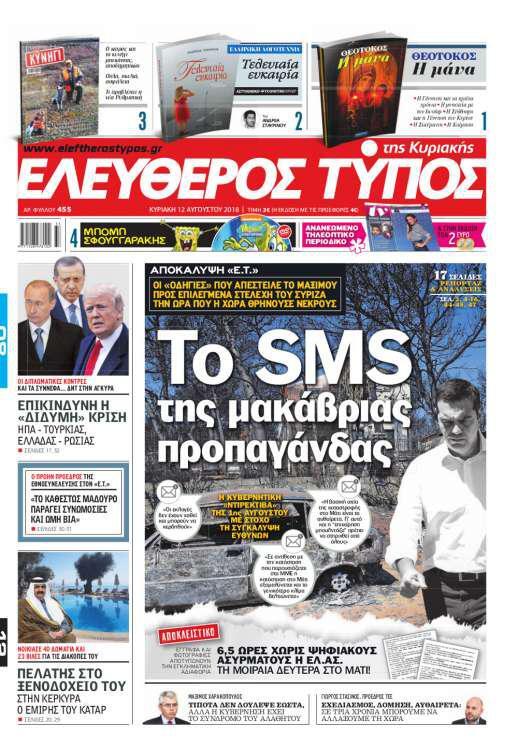 Επίσης, ο Ελεύθερος Τύπος της Κυριακής κυκλοφορεί με ακόμα ένα αποκλειστικό δημοσίευμα που αφορά στη φονική πυρκαγιά στο Μάτι. Για 6,5 ώρες η ΕΛ.ΑΣ. ήταν χωρίς ψηφιακούς ασυρμάτους και η εφημερίδα μας αποκαλύπτει έγγραφα και φωτογραφίες που αποτυπώνουν την εγκληματική αδιαφορία.