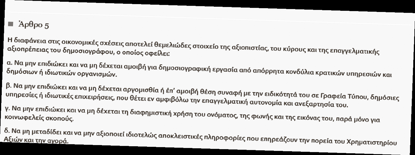 Αλήθεια, ο κ. Καρτερός γνωρίζει τον Κώδικα Δεοντολογίας της ΕΣΗΕΑ; Ο Κώδικας Δεοντολογίας απαγορεύει ρητά σε δημοσιογράφο – μέλος της ΕΣΗΕΑ να ασκεί καθήκοντα συμβούλου σε κυβερνητική θέση ταυτόχρονα με την ιδιότητα του πολιτικού αρθρογράφου, όπως ασκεί ο ίδιος στο Μαξίμου και την εφημερίδα «Αυγή»; Ο κ. Καρτερός παραβιάζει κατάφωρα τον κώδικα δεοντολογίας της ΕΣΗΕΑ και όμως ζητά από την Ενωση Συντακτών να πάρει θέση για το ρεπορτάζ της εφημερίδας μας. Το θράσος του κ. Καρτερού μπορεί να χρησιμεύσει σε κάτι: να ασχοληθεί η ΕΣΗΕΑ με την προκλητική παραβίαση του Καταστατικού και να του αφαιρέσει την ιδιότητα του μέλους της.