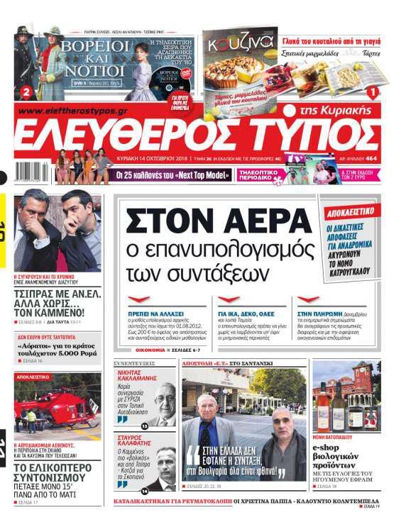 Με κεντρικό τίτλο «Στον αέρα ο επανυπολογισμός των συντάξεων» κυκλοφορεί ο Ελεύθερος Τύπος της Κυριακής, ενώ όπως αποκαλύπτει η εφημερίδα μας, το υπουργείο Εργασίας, πάντως, έχει αποφασίσει να μην αλλάξει τον επανυπολογισμό που έχουν κάνει τα Ταμεία και δεν προτίθεται να λάβει υπόψη στις προσωπικές διαφορές που προκύπτουν τις επιστροφές των μειώσεων που κρίθηκαν αντισυνταγματικές και τις δικαιούνται πίσω στη σύνταξη οι συνταξιούχοι που αρχίζουν να δικαιώνονται στις αγωγές τους.